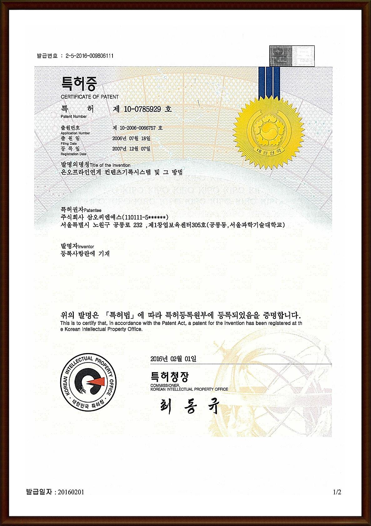 | 온오프라인연계 컨텐츠기록시스템 및 그 방법 (10-0785929) | VIEWER > |
