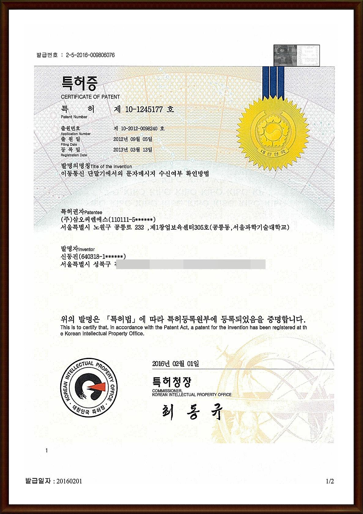 | 이동통신 단말기에서의 문자메세지 수신여부 확인방법 (10-1245177) | VIEWER > |